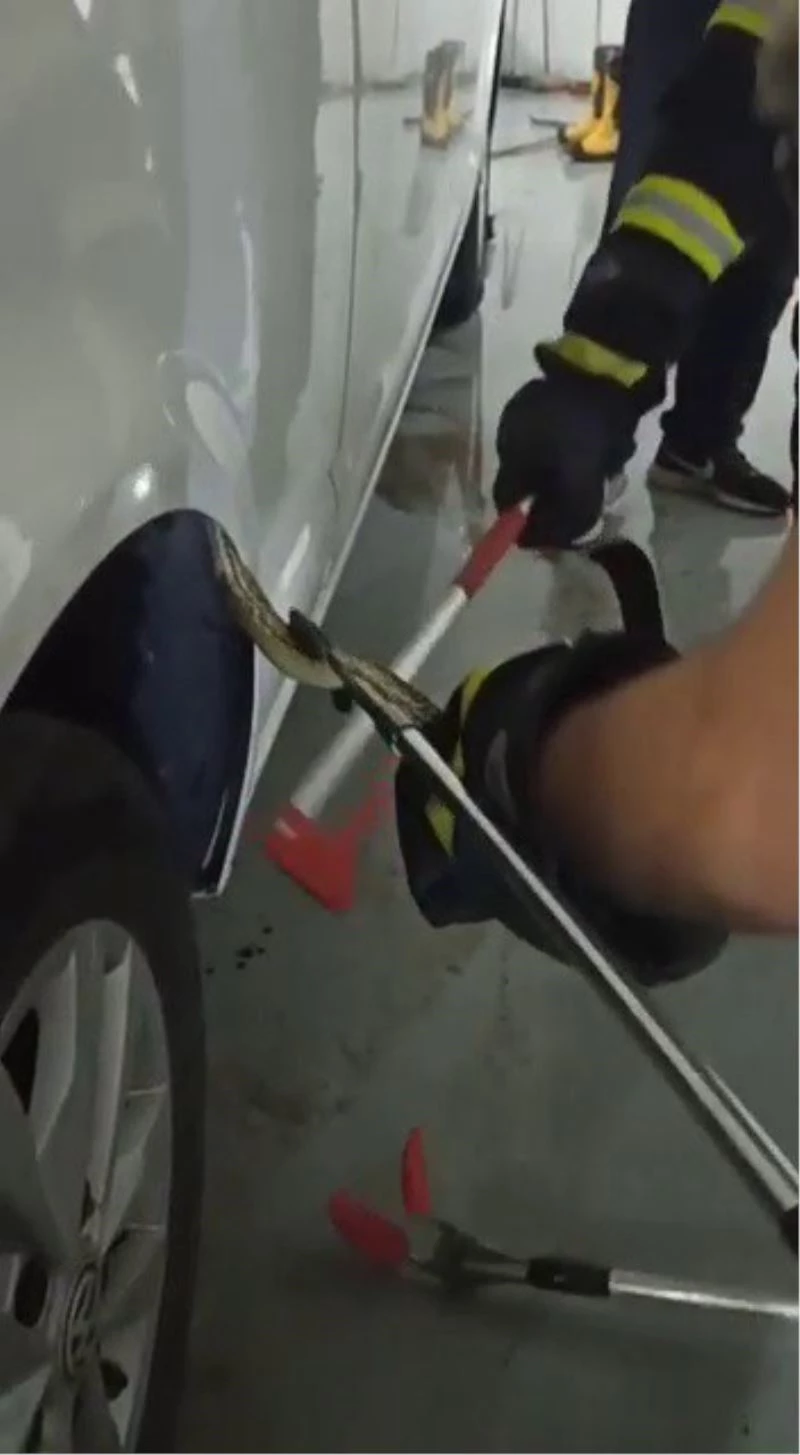 Sivas'ta bir itfaiye aracının çamurluk kısmına giren yılan itfaiyeciler tarafından çıkarıldı.