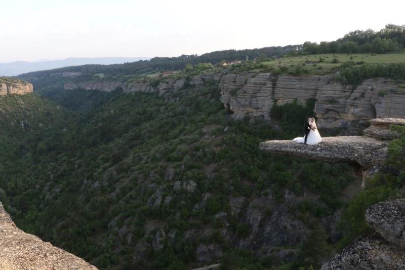Karabük’e 400 kilometre uzaklıkta bulunan İstanbul’dan Safranbolu ilçesine bağlı Düzce köyündeki Sırçalı Kanyonu’na gelen çift, milyonlarca yıl önce oluşumu meydana gelen ve halk tarafından "taş teras" olarak adlandırılan kayanın üzerinde düğün fotoğraflarını çektirdi.