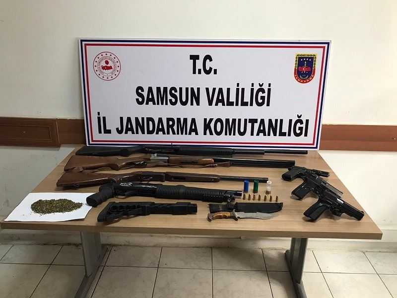 Samsun’un İlkadım İlçesi Gürgendağ Mahallesi’nde 31 Mayıs Pazar günü Samsun İl Jandarma Komutanlığı Kaçakçılık ve Organize Suçlarla Mücadele Şube Müdürlüğü ve İlkadım İlçe Jandarma Komutanlığı ekiplerince yapılan teknik ve istihbari çalışmalar sonucu şüpheli 4 şahsın ev ve eklentileri ile ormanlık alanda Samsun Cumhuriyet Başsavcılığından alınan arama kararına istinaden yapılan arama neticesinde 105 bin kök kenevir bitkisi, 4 adet ruhsatsız av tüfeği, 3 adet ruhsatsız tabanca ile 1 adet 2521 sayılı Kanun kapsamında bıçak ele geçirildi. İcra edilen arama faaliyetlerinin devamında ve elde edilen bilgiler doğrultusunda arama-tarama faaliyeti geliştirilerek bölge kontrol edildiğinde 18 kilogram kurumaya bırakılmış kubar esrar maddesi de elde edildi.