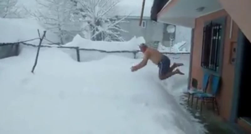 Kastamonu’nun Çatalzeytin ilçesinde bir esnaf, kalınlığı yaklaşık 1,5 metreye ulaşan karda soyunarak yüzmeye çalıştı.
