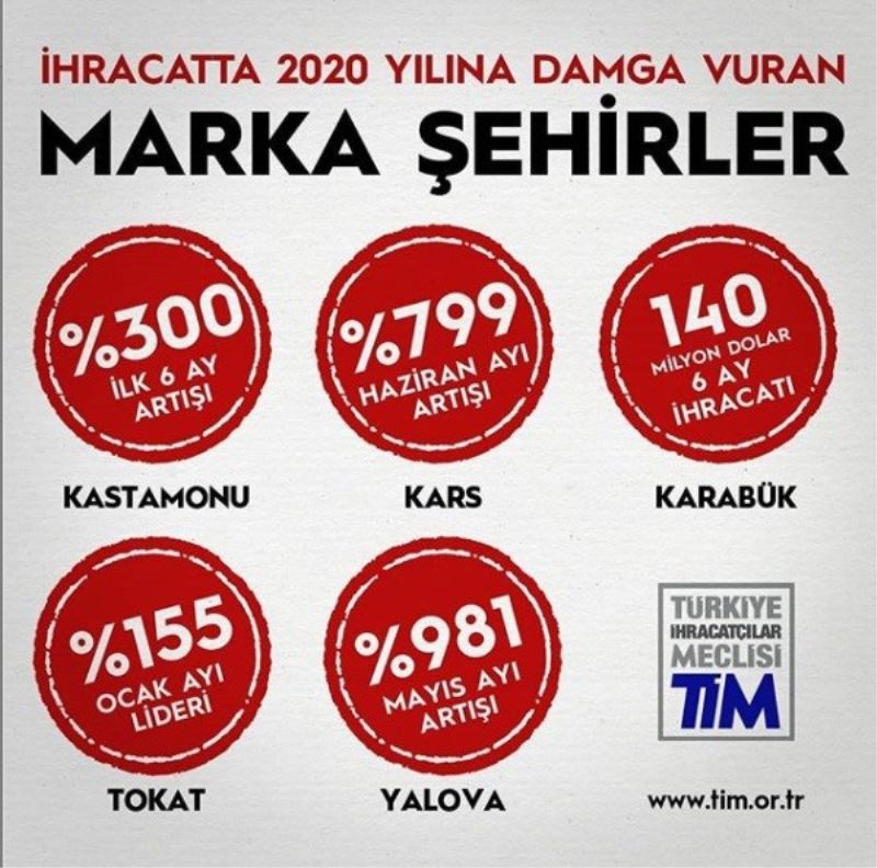 Türkiye İhracatçılar Meclisi (TİM) verileri Tokat’ın, 2020 yılının Ocak ayında bir önceki yıla göre ihracatını en çok artıran şehir olarak açıklandı. 2019 yılında 18,1 milyon dolar ihracata imza atan kentin yılın ilk ayındaki yüzde 155’lik artış performansı dikkat çekti. Sanayi, tarım ve hayvancılık sektörlerinin ekonomide önemli rol oynadığı Tokat’ın ihracat başarısı, şubat, nisan ve haziran aylarında da devam ettiği kaydedildi. Konuyla ilgili değerlendirmelerde bulunan Tokat Ticaret ve Sanayi Odası Başkanı Ali Çelik, Tokat’ın yılın ilk dört ayı, ihracatını en çok artıran ilk 10 kent arasına girmeyi başardığını kaydetti. Gıda sanayi başta olmak üzere, taş ve toprağa dayalı sanayi, orman ürünleri sanayisi ve son yıllarda tekstil dokuma ve konfeksiyon sektörü, Tokat ekonomisinin bel kemiğini oluşturduğunu belirten Başkan Çelik, “2019 yılı Ocak ayı ihracatımız 1 milyon 50 bin dolar civarında idi. 2020 yılı ocak ayı ihracatımız 2 milyon 551 bin dolar olarak gerçekleşti. Buda yüzde 155’lik bir artışa tekabül ediyor. TİM ve Karadeniz ihracatçılar Birliği her ay bunun istatistiklerini veriyor. 2020 yılı içerisinde 81 il içerisinde ihracat rakamlarını en fazla artıran il olarak Tokat’ın ismi ulusal medyada paylaşıldı. Daha çok bu ihracat rakamlarının içerisinde gıda, orman ürünleri, mermer bize iletilen az bir miktarda tekstil ürünleri var” dedi.