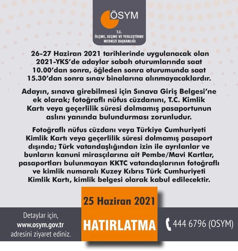 2021-YKS, 26-27 Haziran tarihlerinde cumartesi günü saat 10.00’da Temel Yeterlilik Testi (TYT), pazar günü saat 10.00’da Alan Yeterlilik Testi (AYT) ve pazar günü saat 15.30’da Yabancı Dil Testi (YDT) olmak üzere üç oturumda gerçekleşecek. Adaylara TYT’de 120 soru için 135 dakika, AYT’de 160 soru için 180 dakika, YDT’de 80 soru için 120 dakika süre verilecek. Üç oturumdan oluşan YKS, KKTC Lefkoşa’da dahil olmak üzere toplam 200 sınav merkezinde uygulanacak. Sınavlarda üç oturumda toplam 727 bin 820 kişi görev alacak. 26 Haziran Cumartesi günü gerçekleştirilecek ilk oturum olan Temel Yeterlilik Testi’ne (TYT), 2 milyon 592 bin 579 aday katılacak. TYT’ye engel gruplarına göre oluşturulan tekli ve toplu salonlarda toplam 10 bin 231 engelli aday girecek. TYT’de 420 bin 178 kişi görev alacak. Ayrıca, 27 Haziran Pazar günü yapılacak ikinci oturum olan Alan Yeterlilik Testlerine (AYT) 1 milyon 781 bin 760 aday katılacak. AYT’ye 6 bin 799 engelli aday girecek. AYT’de 282 bin 484 kişi görev alacak. 27 Haziran Pazar günü saat 15.45’te gerçekleşecek üçüncü oturum olan Yabancı Dil Testinde (YDT) ise 130 bin 522 aday sınava girecek. YDT’ye, 512 engelli aday katılacak. YDT’de 25 bin 158 kişi görev alacak.