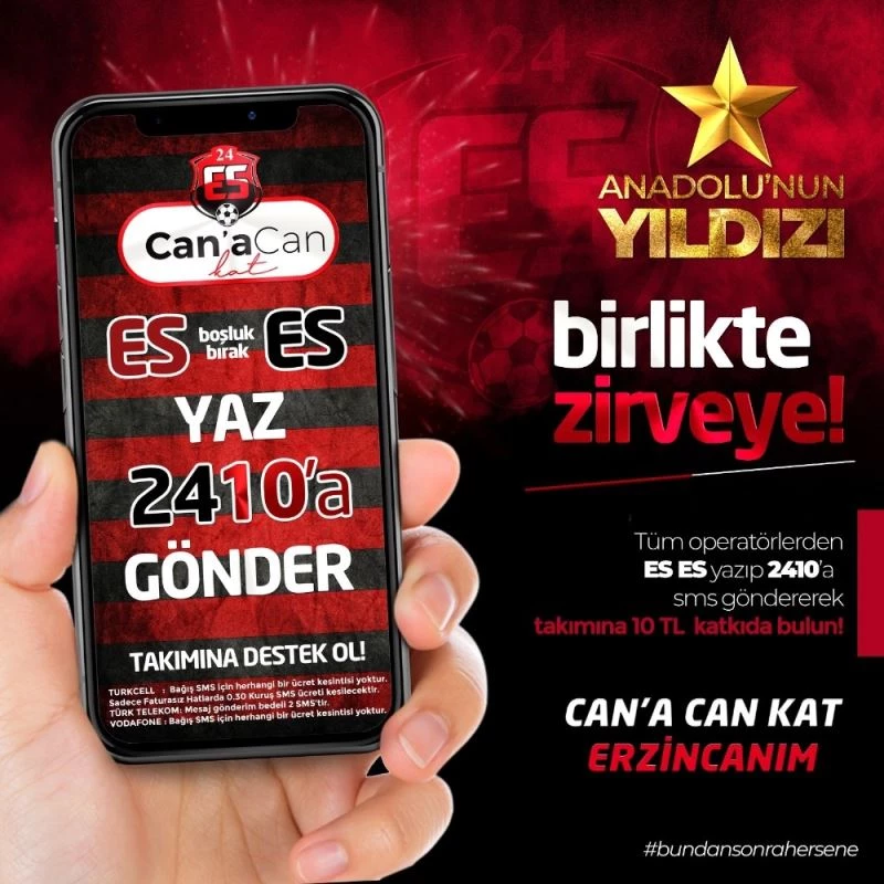 Çalışmalarla ilgili olarak bilgi veren 24Erzincanspor Kulüp Başkanı Gökhan Keleş, “2. Ligin yeni takımı olarak şehrimizin ve taraftarlarımızın beklentisine en iyi cevabı verecek şekilde öncelikli olarak transfer çalışmalarımızı yaptık. 24Erzincanspor’da hedef daima bir üst ligdir. Bizler takıma gelir sağlayacak çalışmalar yapmak adına yönetim kurulu olarak SMS kampanyası başlattık. Başlattığımız ‘Can’a’ Can Kat’ SMS projemiz ile tüm Erzincan ve 24Erzincanspor sevdalılarımızı kampanyamıza destek olmaya davet ediyoruz. ES boşluk bırakıp ES yazıp 2410’a göndererek her SMS karşılığı 10 TL destek olabilirsiniz” dedi.