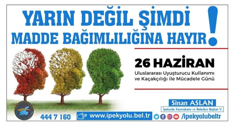 Uyuşturucu kullanımı ve kaçakçılığının bir insanlık suçu olduğuna vurgu yapan İpekyolu Kaymakamı ve Belediye Başkan Vekili Sinan Aslan, “Madde kullanımı, bağımlılık düzeyinde önemli bir sorun haline dönüşmeden, acilen maddeye olan talebin azaltılmasına, etkin bir mücadeleye, amacına uygun olarak kamuoyu ve bağımlı birey çevresinin eğitimine ve bilinçlendirilmesine yönelik çalışmaların yapılması mümkündür. Yine bu suça bulaşan kişilere karşı kesinlikle en ufak bir taviz vermeden, sıfır toleransla, gerek toplum olarak ve gerekse tüm kamu kurum ve kuruluşları olarak topyekun bir mücadele vermemiz gerekmektedir. Uyuşturucu ile mücadelenin etkin bir biçimde sürdürülmesi, madde kullanımının tüm nüfus açısından önlenmesi, özellikle risk gruplarının (çocuklar, gençler) korunması önceliklerimizi oluşturmaktadır. Sağlıklı bir yaşam için, geleceğimiz olan çocuklarımızı ve gençlerimizi uyuşturucudan koruyalım. Uyuşturucu bir insanlık suçu ve sağlık sorunudur” ifadelerini kullandı.