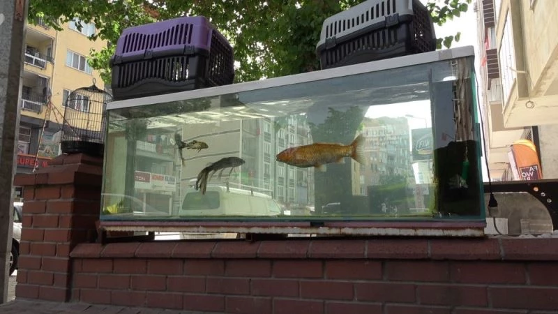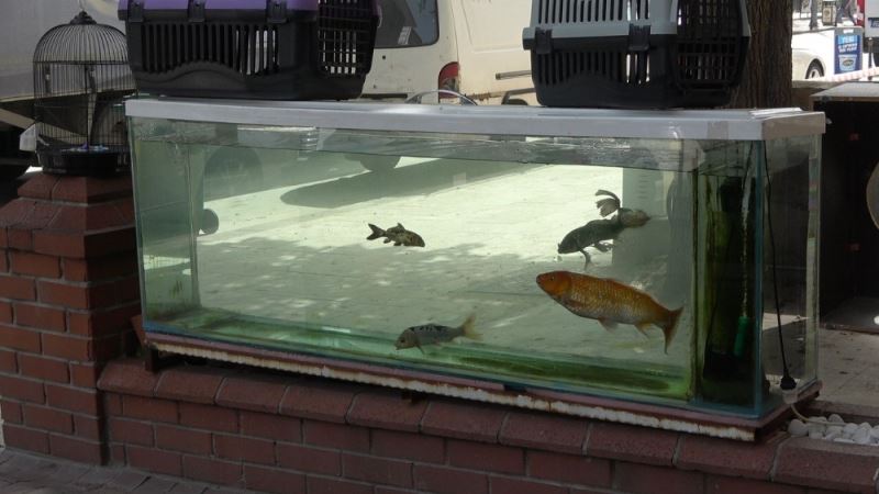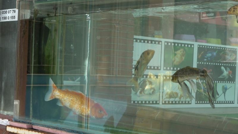 Dükkan dışında bulunan akvaryumda yaşayan koi balığını görenler akvaryumu bir süre izledikten sonra yollarına devam ediyor.