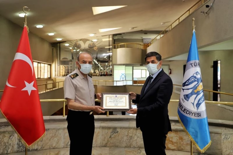 Başkan Aksun, Korgeneral Öngay’a ziyaret esnasında, fahri hemşehrilik beratını takdim etti.