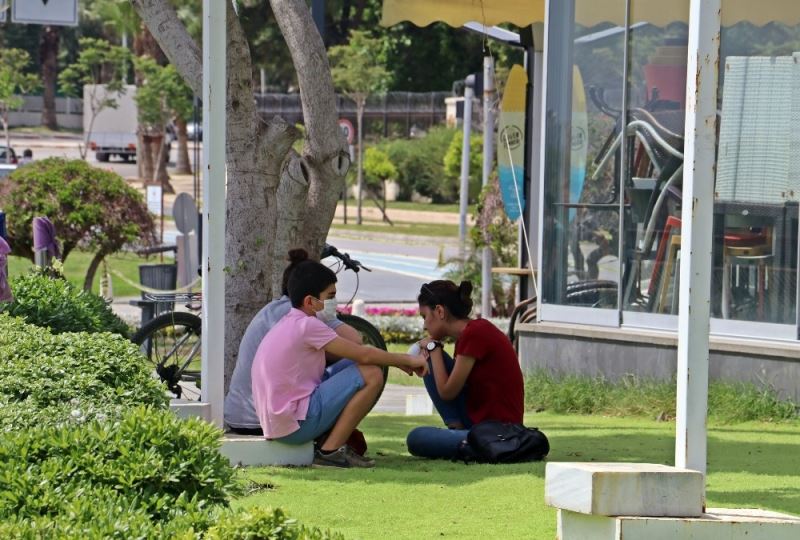 Antalya’da 42 gündür sokağa çıkmaları yasak olan 14-20 yaş arası çocuklar ve gençler, 35 dereceyi bulan kavurucu sıcaklıkla karşılaşınca 4 saatlik izni ağaç gölgelerinde geçirdi. Bazı gençler de dünyaca ünlü sahile gelip, bol bol fotoğraf çekindi.