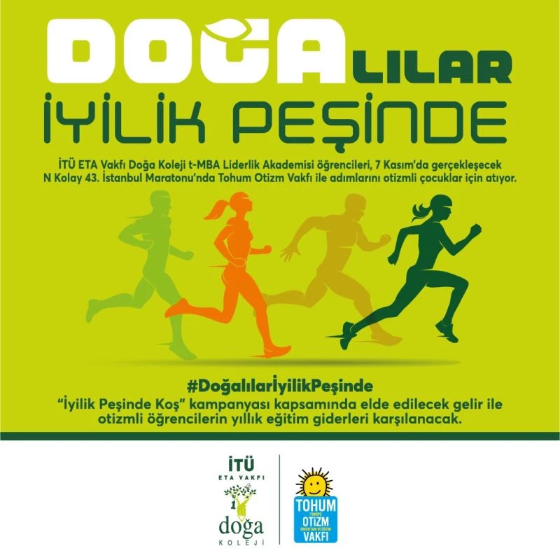 İTÜ ETA Vakfı Doğa Koleji t-MBA Liderlik Akademisi öğrencileri, başlattıkları sosyal sorumluluk projesi kapsamında 7 Kasım’da gerçekleşecek N Kolay 43. İstanbul Maratonu’nda adımlarını otizmli çocuklar için atacak.