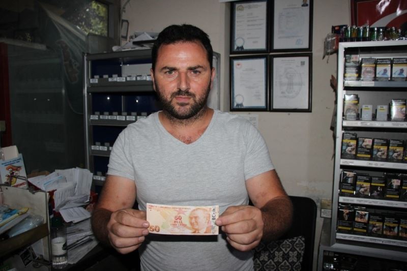 Yalı Mahallesi Muhtarı olan, aynı zamanda market işleten Bülent Öztürk’ün alışveriş sırasında eline hatalı basım 50 TL’lik banknot geçti. Hatalı basılan 50 TL’lik banknotun sağ üst köşesinde 50 sayısı yerine 5 rakamı bulunuyor.