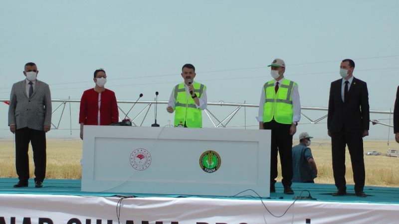 Bugün de Mezopotamya topraklarını suyla buluşturacak, Türkiye’nin en büyük tarım işletmesi Ceylanpınar’da 60 bin dekar araziyi sulamaya açtıklarını belirten Bakan Pakdemirli, “66 yıllık kurumumuz Devlet Su işleri Genel Müdürlüğümüz ile Türkiye tarımının güvencesi, en büyük çiftçi kuruluşumuz TİGEM tarafından yürütülen Ceylanpınar Sulama Projemiz yaklaşık 70 milyon lira yatırım bedeli ile hayata geçirildi. Proje sayesinde tek tuşla binlerce dönüm arazi sulanabilecek. Dolayısıyla bu arazilerde nadas sistemi kalkacak, ikinci ürün ekilişleri sayesinde bitki çeşitliliği artacak, verim ve kalitede artış gerçekleşecek. Hububat verimi dekardan 250 kilogramdan 500 kilograma çıkacak ve kalite yükselecek” dedi.