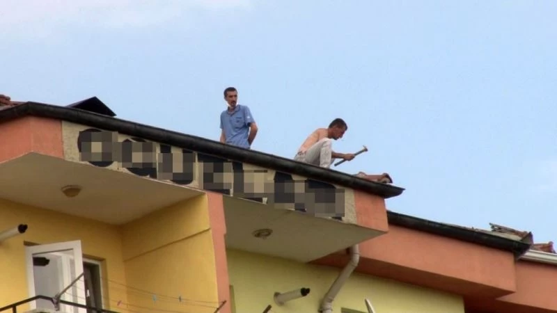 71 Evler Mahallesi’nde bulunan apartmanın çatısında hiçbir güvenlik önlemi almadan çalışan 2 kişi, çevrede yaşayanlara korku dolu anlar yaşattı. Şahısların, onlarca metre yüksekteki binanın tepesinde olmaları ve tedbir almamalarına rağmen çalışanların rahat tavırları, görenleri hayrete düşürdü. İşçi olduğu tahmin edilen 2 şahıs, çalışmalarına ara verdikleri esnada ise etrafı seyretti. Tehlikeye rağmen uzun süre çalışmasını sürdüren şahıslar, işlerini bitirdikten sonra çatıdan indi.