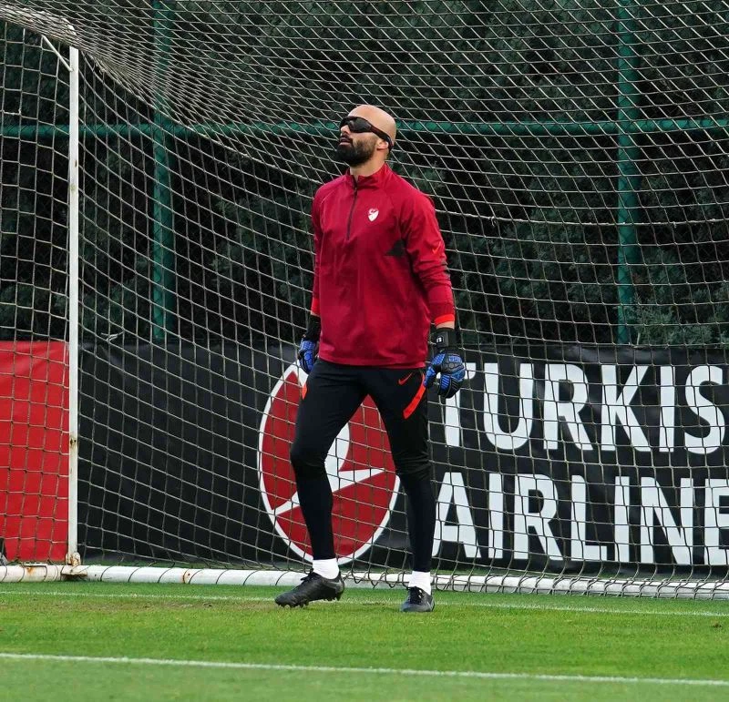 Kaleciler Uğurcan Çakır, Ersin Destanoğlu ve Sinan Bolat, görüş açılarını kapatan özel bir gözlükle çalışmalarını gerçekleştirdi ve yandan yapılan orta çalışmalarında kaleciler topu kontrol etmeye çalıştı.