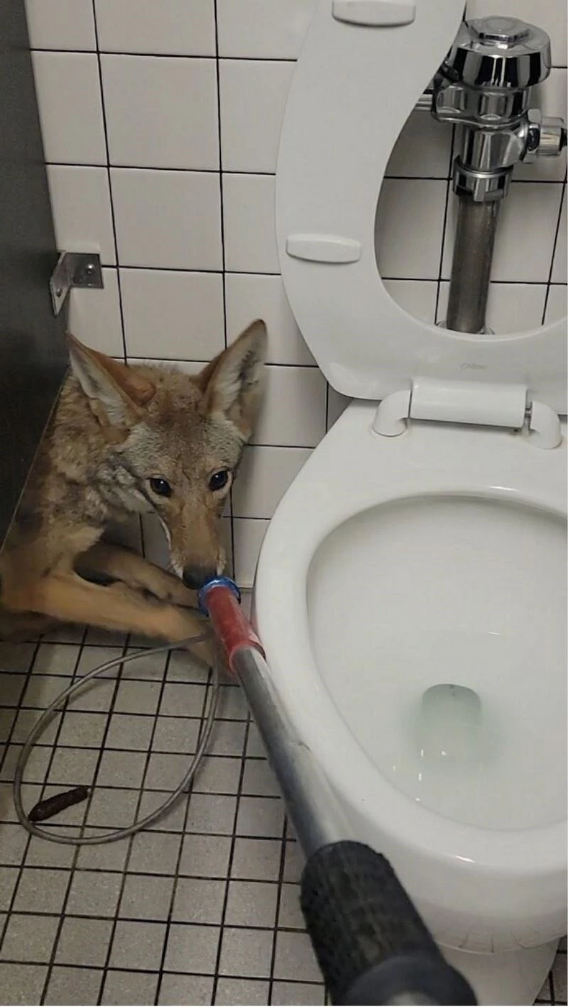 ABD’nin California eyaletindeki bir okul tuvaletine sığınan çakal, Riverside County Hayvan Hizmetleri tarafından kurtarılarak doğaya salındı.