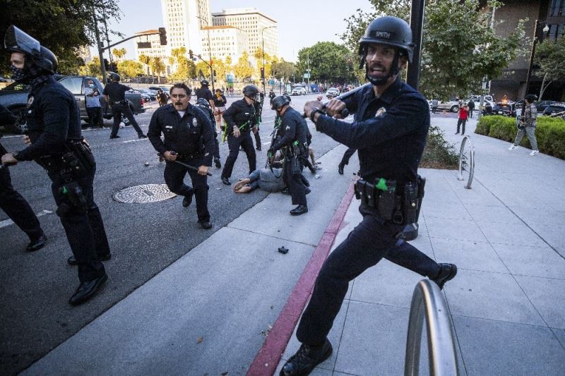 ABD’de siyahi George Floyd’un polis tarafından öldürülmesinin ardından başlayan ırkçılık karşıtı eylemler haftalardır birçok şehirde devam ediyor. California eyaletine bağlı Los Angeles kentinde yüzlerce kişi ülkede artan ırkçılığı ve polis şiddeti protesto etmek amacı ile bir araya geldi. Belediye binası önünde barışçıl şekilde başlayan eylemler kısa süre sonra şiddet olaylarına dönüştü. Sosyal medyada paylaşılan görüntülerde polisin kadın eylemciyi itmesi ile arkadan gelen diğer bir eylemcinin polise saldırdığı ve yere yıktığı görülüyor. Saldırının ardından polis ve göstericiler arasında arbede çıkarken, çok sayıda gösterici gözaltına aldı.