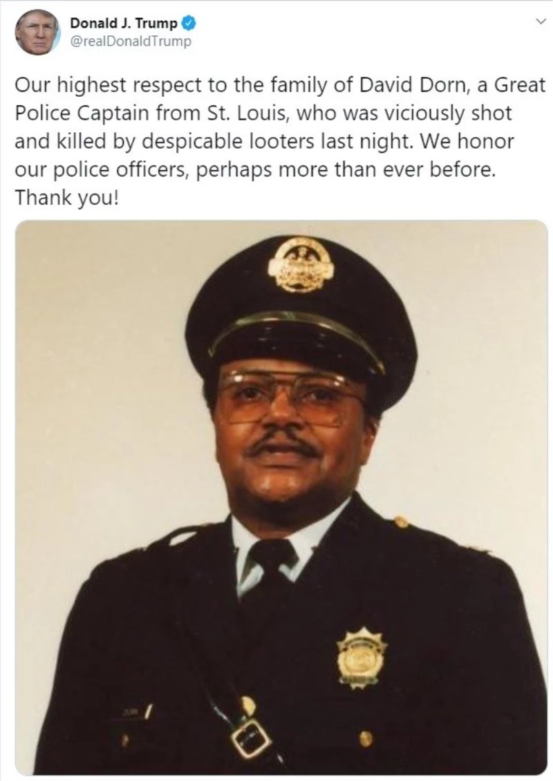 ABD Başkanı Donald Trump da, Dorn’un hayatını kaybetmesini kınadı. Aktif olarak kullandığı sosyal medya hesabı üzerinden açıklama yapan Trump, “Yağmacılar tarafından vahşice vurulan ve öldürülen David Dorn’un ailesine büyük saygı duyuyoruz. Polis memurlarımızı, belki de her zamankinden daha fazla onurlandırıyoruz” ifadelerini kullandı.