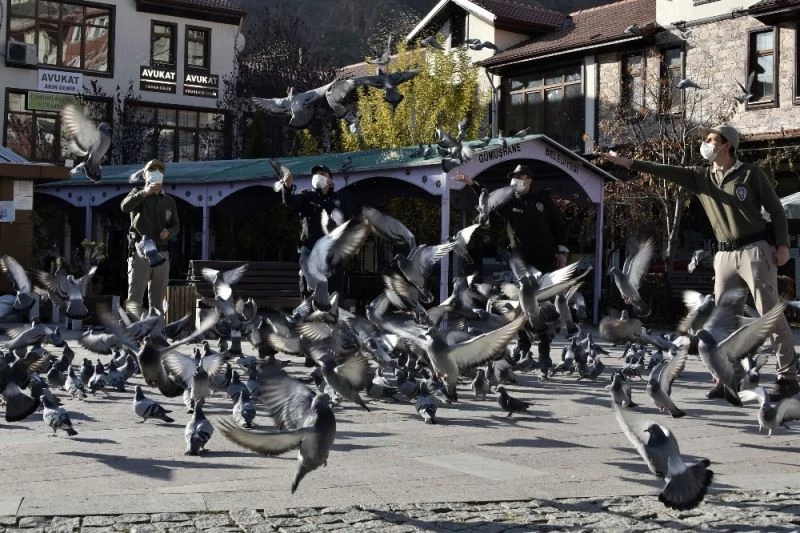 Gümüşhane kent merkezinde normal zamanlarda vatandaşlar tarafından doyurulan güvercinler sokağa çıkma kısıtlaması nedeniyle aç kalınca imdadına polisler yetişti.
