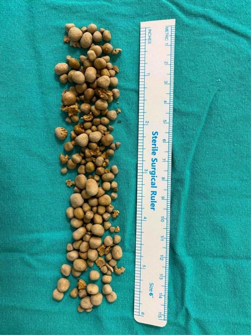 Üroloji uzmanı Dr. Cem Şah ve ekibi tarafından endoskopik yöntemle Okur'un mesanesinden irili ufaklı 139 taş çıkarıldı.