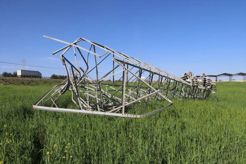 Bölgedeki kuvvetli rüzgarın da etkisiyle elektrik direği, bulunduğu tarlaya devrildi.