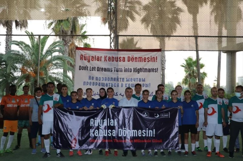 Merkez Yüreğir ilçesinde bir halı saha da gerçekleşen etkinlikte, Adana İdmanyurdu Kadın Futbol Takımı, Çukurova Uluslararası Öğrenci Derneği (ÇUDER) üyesi öğrenciler ve İl Göç İdaresi Müdürlüğü çalışanları Dünya İnsan Ticareti Günü'nde farkındalık yaratmak amacıyla dostluk maçı yaptı.