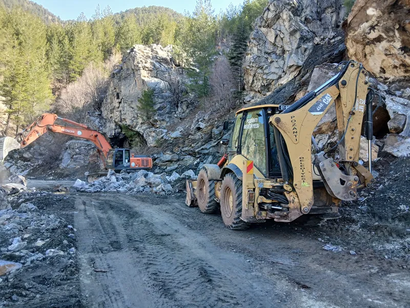 Ekiplerin iş makineleriyle yürüttüğü temizlik çalışması sonrası yol yeniden trafiğe açıldı.