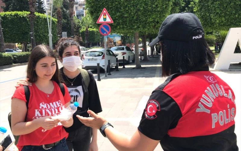 ADANA (AA) - Adana'da polis ekipleri, yeni tip koronavirüs (Kovid-19) tedbirleri kapsaminda banka önlerinde sira bekleyen ve sokakta yürüyenlere sosyal mesafe uyarisinda bulunarak maske dagitti.
