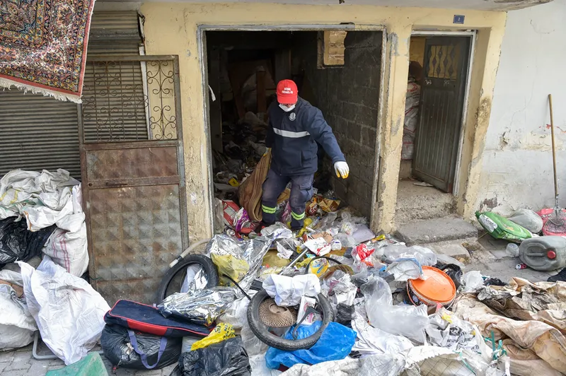 ADANA - Adana'da belediye ekiplerince temizlik çalışması yapılan evden iki kamyon çöp çıkarıldı.