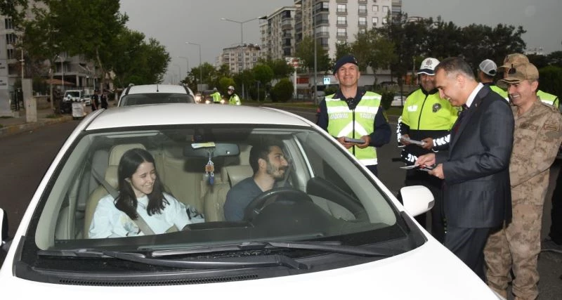 Vali Mahmut Çuhadar, emniyet kemeri denetimi sırasında sürücülere kampanya ile ilgili bilgilendirici broşürler dağıttı.