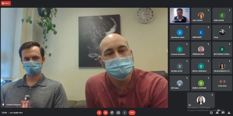 Dr. Öğr. Üyesi Dinçer Cüre’nin organize ettiği etkinliğe, Amerika Birleşik Devletleri (ABD) New York Eyaletine bağlı Buffalo şehrindeki özel bir kliniğin sahibi Dr. Fzt. Anthony Sterlace ve stajyer öğrencisi katıldı. Nazilli Sağlık Hizmetleri MYO öğretim elemanları, Fizyoterapi Programı öğrencilerinin katıldığı ve Dr. Öğr. Üyesi Dinçer Cüre’nin simultane tercüme ettiği toplantıda, Dr. Fzt. Anthony Sterlace, A.B.D.’de hastaların fizyoterapi hizmetlerine nasıl ulaştıklarını, Covid-19 pandemisinin tedavi planlarına etkisini ve tedavi prensiplerini anlattı. Dr. Fzt. Anthony Sterlace, önlisans Fizyoterapi öğrencilerine önerilerde bulunarak, öğrencilerin ve öğretim elemanlarının sorularını cevapladı.