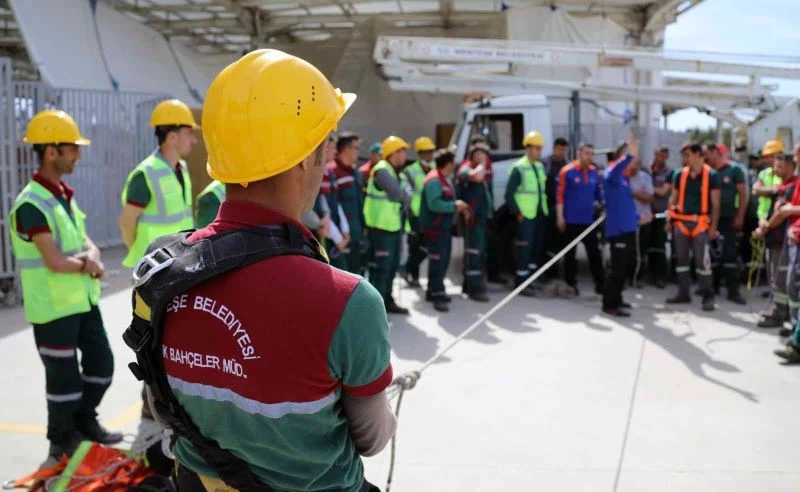 Menteşe Belediyesi personeline AFAD Eğitim Uzmanları tarafından vücut tipi emniyet kemeri kullanımı, bağlama teknikleri ve yüksekte yapılacak diğer operasyonlara ilişkin eğitim verildi.