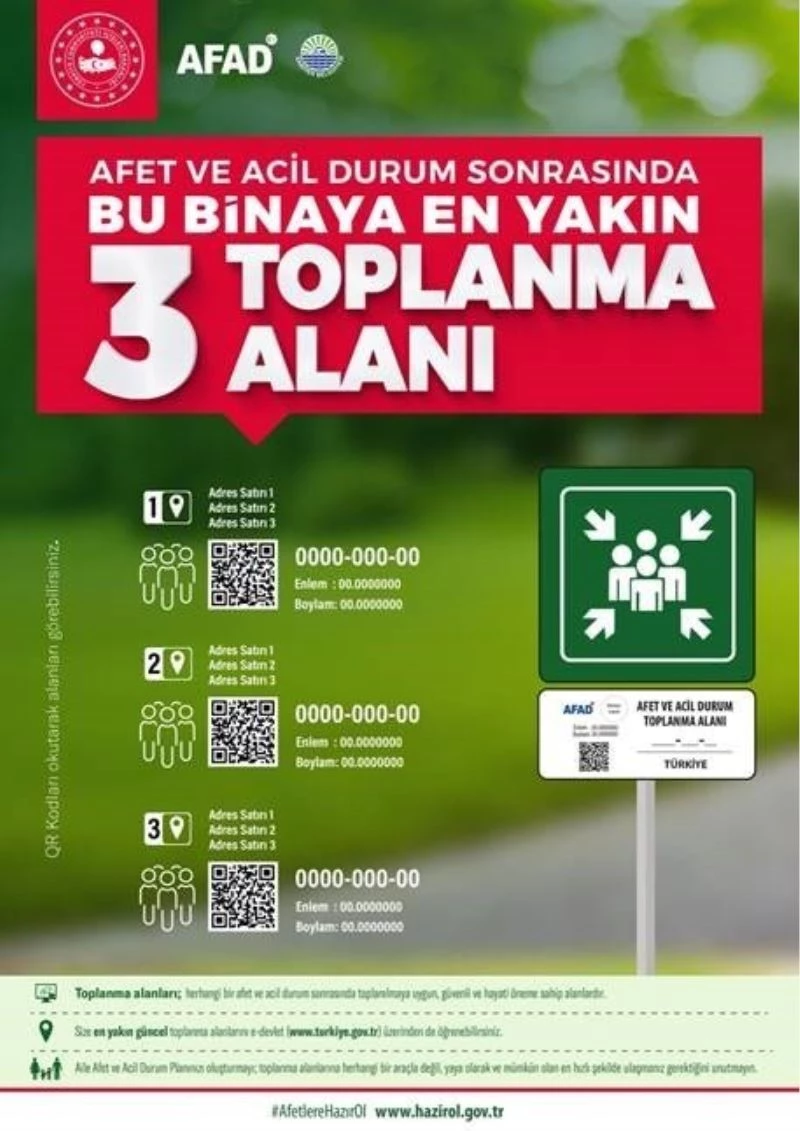AFAD tarafından acil toplanma alanı tespit kriterlerinin neler olduğunun da anlatıldığı açıklamada, “Afet ve acil durum toplanma alanı tespit kriterlerini bölgedeki nüfus yoğunluğu, alanın ulaşılma ve tahliye edilme kolaylığı, alanın mümkün olduğunca engellilerin ve yaşlıların ulaşımına uygun olması, ikincil tehlikelerden uzaklığı, mümkün olduğunca engebesiz düz arazilerde yer alması, konut alanlarına yakın ancak yapısal ve yapısal olmayan unsurlardan etkilenmiyor olması, elektrik, su, tuvalet gibi temel ihtiyaçlar ve benzeri unsurların karşılanabileceği yapılara yakın olması oluşturuyor” ifadelerine yer verildi.