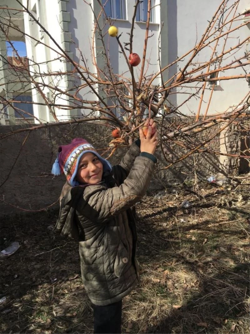 Sivas’ın Şarkışla ilçesinde minik öğrenciler soğuk havalarda yiyecek bulmakta zorlanan hayvanlar için ağaçlara çeşitli meyveler astı.
