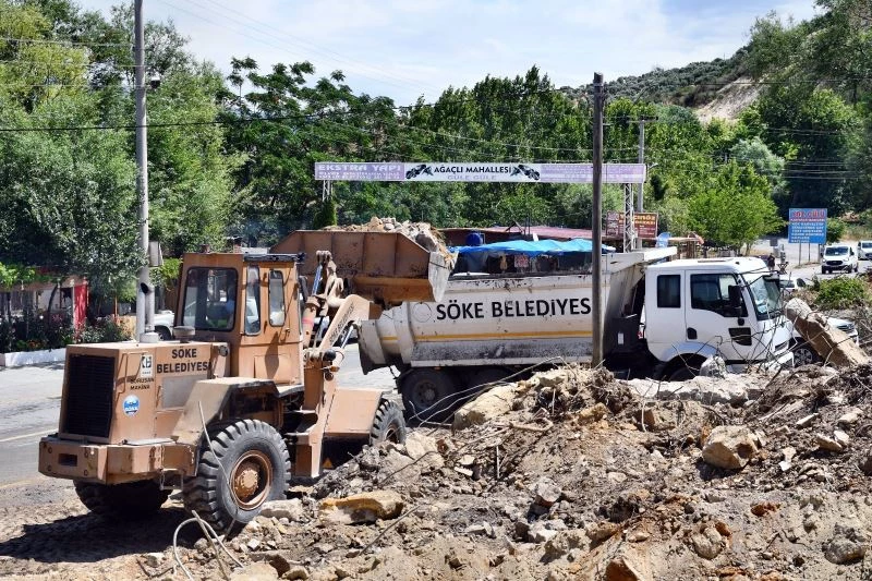 Söke’nin sahil siteleri yol güzergahında bulunan, özellikle yaz mevsiminde trafiğin yoğun olduğu Ağaçlı Mahallesi’ndeki metruk binalar Söke Belediyesi tarafından yıkılıyor. Yol üzerinde harabeye dönen ve yıllardır atıl durumdaki eski dükkanlar, Söke Belediyesi Şantiye ekiplerince yıkılırken, yıkımdan doğan molozlar temizlendi. Açılan alana üst yapı malzemesi serildi.