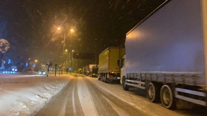 Düzce’de aralıklarla yağan kar yağışı akşam saatlerinde etkili oldu. Kısa süre içerisinde kent geneli beyaza bürünürken, Düzce-Zonguldak D-655 Karayolu’nda ağır tonajlı araçların geçişine izin verilmedi. Düzce İl Emniyet Müdürlüğü ve İl Jandarma Alay Komutanlığı ekipleri tarafından her iki şeritte de ağır tonajlı araçların geçişine izin vermedi. Saat 18.00’da ağır tonajlı araçların geçişine kapatılan yolda kilometrelerce uzunluğunda tır ve kamyon kuyruğu oluştu. Bölgede bekleyen sürücüler saatlerdir yolun açılmasını bekliyor.