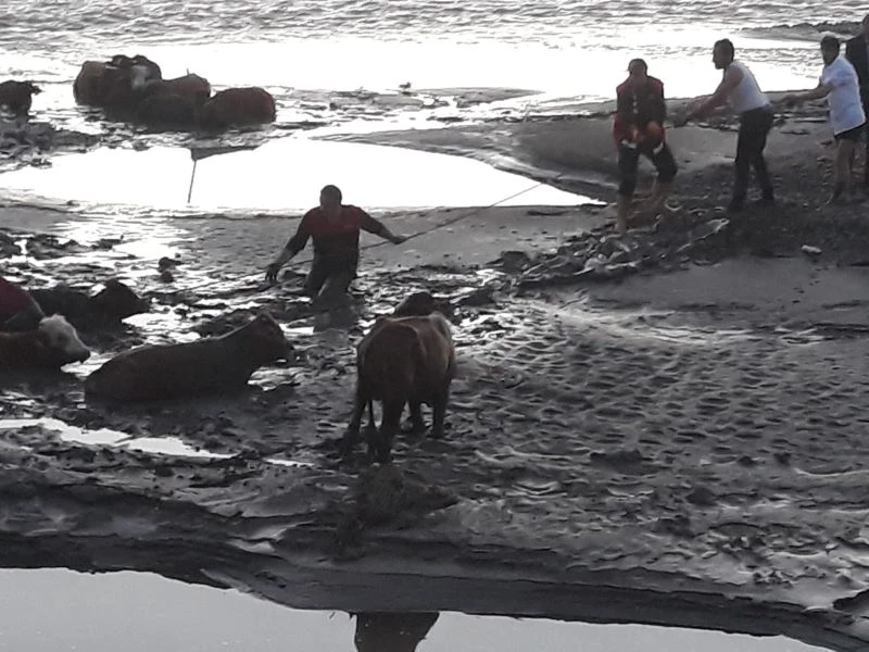 Ağrı’da Murat Nehri yakınlarında bataklığa saplanan 17 inek itfaiye ekipleri tarafından kurtarıldı.