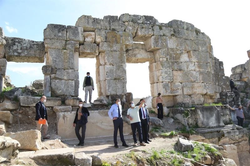 Anadolu’daki en iyi korunmuş Zeus Tapınağı ile dünyanın ilk borsasına ev sahipliği yapan antik kentte hummalı çalışmaları yerinde inceleyen Vali Ali Çelik, son durum hakkında bilgiler aldı. 2 No’lu Roma köprüsünün restorasyon çalışmalarının titizlikle sürdürüldüğünü kaydeden Vali Çelik, Penkalas Çayı projesi kapsamında başlatılan kazı çalışmalarında orijinal rıhtım duvarlarına ulaşıldığını, tapınak karşısında devam eden kazıda ise Agora’nın gün yüzüne çıkarılmaya başlandığını söyledi.