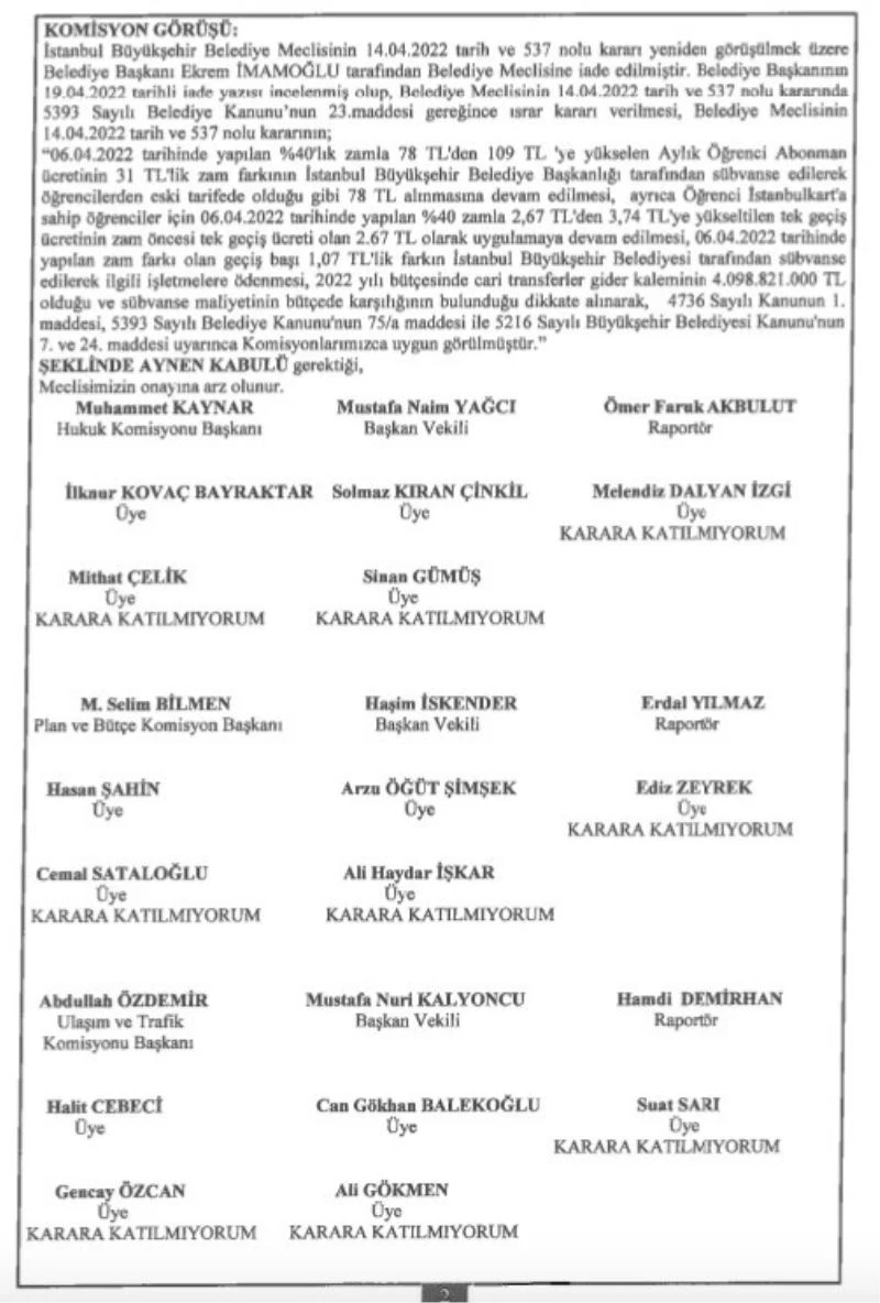 İstanbul Büyükşehir Belediye Meclisi AK Parti ve MHP Grubu’nun teklifiyle öğrenci kartlarına yapılan yüzde 40’lık zammın geri alınmasına ilişkin karar, Büyükşehir Belediye Başkanı Ekrem İmamoğlu’nun vetosunun ardından ısrar karar olarak tekrar meclise sunuldu. CHP ve İYİ Parti’nin “Hayır” oyuna rağmen oy çokluğuyla tekrar kabul edilen karara ilişkin açıklama yapan AK Parti İstanbul İl Başkanı Osman Nuri Kabaktepe, “İşin peşini bırakmadık, gençlere verdiğimiz sözü tuttuk. Cumhur İttifakı’nın takibi ve ısrarı ile İstanbul’da öğrenci abonman ücretlerine yapılan yüzde 40 ulaşım zammı geri çekildi. Sevgili gençler hayırlı olsun” dedi.