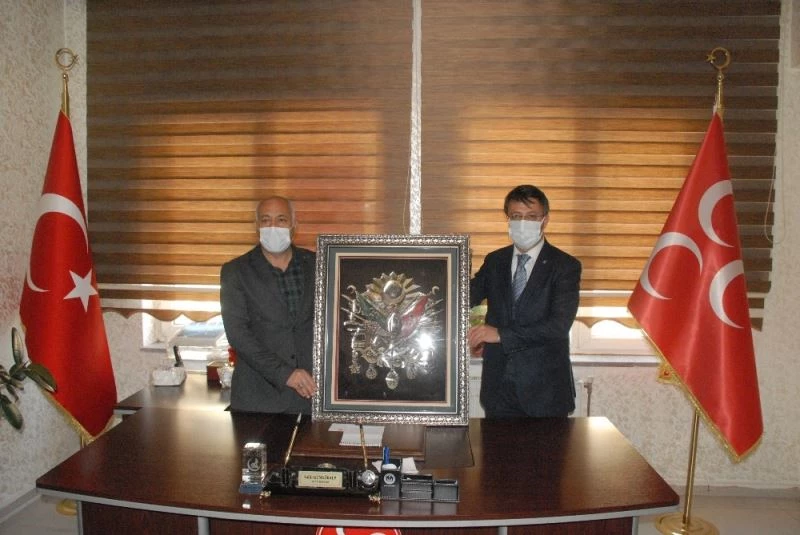 Yapılan ziyaretin sonunda AK Parti İl Başkanı Kayhan Türkmenoğlu tarafından MHP Van İl Başkanı Salih Güngöralp’a günün anısına Osmanlı Tuğralı tablo hediye etti.