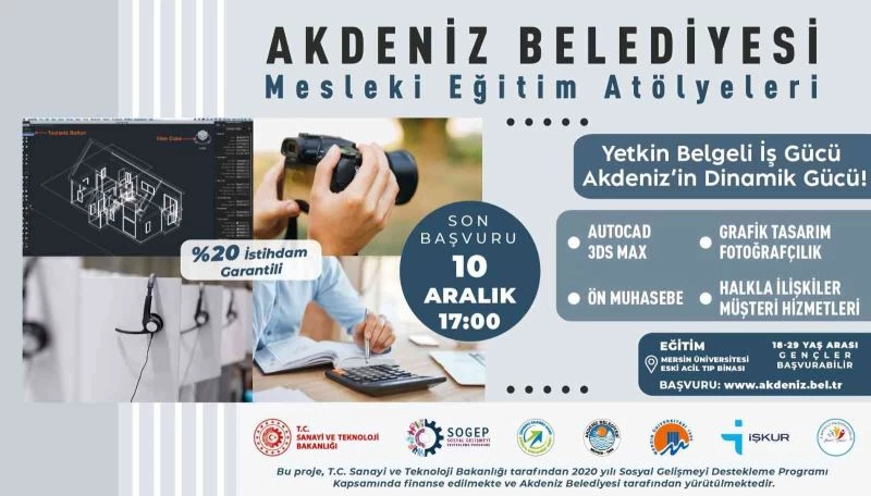 Akdeniz Belediyesi tarafından yürütülen ve Sanayi ve Teknoloji Bakanlığı tarafından 2020 yılı Sosyal Gelişmeyi Destekleme Programı kapsamında finanse edilen Mesleki Eğitim Atölyeleri başlıyor.