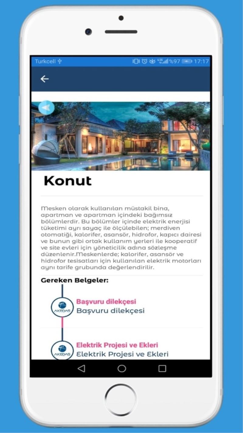 Akedaş Elektrik Dağıtım A.Ş. mobil uygulamayı faaliyete geçirerek, ilk aşamada planlı elektrik kesintisi, arıza bildirimi, kaçak elektrik ihbarı, duyurular, yeni bağlantı bilgileri, tasarruf bilinci üzerine ipuçları, tüm talep öneriler ve süreç takibi ile ilgili bilgi trafiğini bu uygulama üzerinden yürütecek.