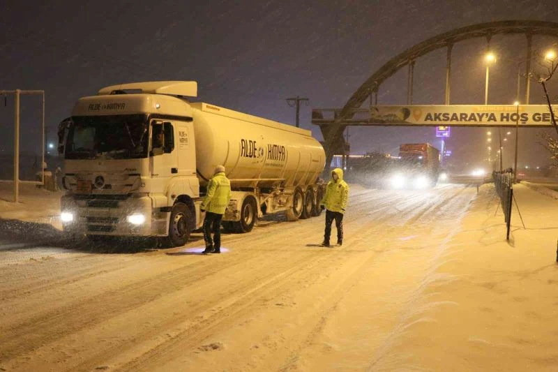 Aksaray’da 3 gündür etkili olan kar yağışı ve tipi nedeniyle akşam saatlerinde kapanan Aksaray-Ankara karayolunun ardından Adana ve Nevşehir karayolları da tır ve ağır tonajlı araçlara trafiğe kapatıldı. Gidiş ve gelişli olmak üzere her 2 yönlerde de tır ve ağır tonajlı araçlara trafiğe kapatılan yollarda polis ekipleri bu araçların geçişine izin vermedi. Güvenlik önlemlerinin alındığı karayollarında tır ve ağır tonajlı araçlar yolun sağ tarafına ve bölgede bulunan tesislere yönlendirildi. Kar yağışının halen etkisini sürdürdüğü kentte çalışmalar aralıksız sürüyor.