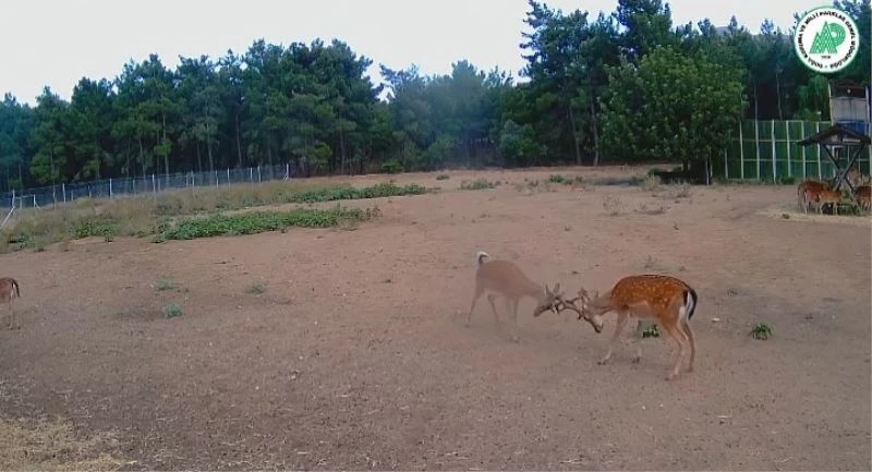Eşen Adası Alageyik Üretme İstasyonunda bulunan alageyiklerin birbiri ile önce boks yapar gibi kavga etmesi, ardından toslaşmaları foto kapana yakalandı.