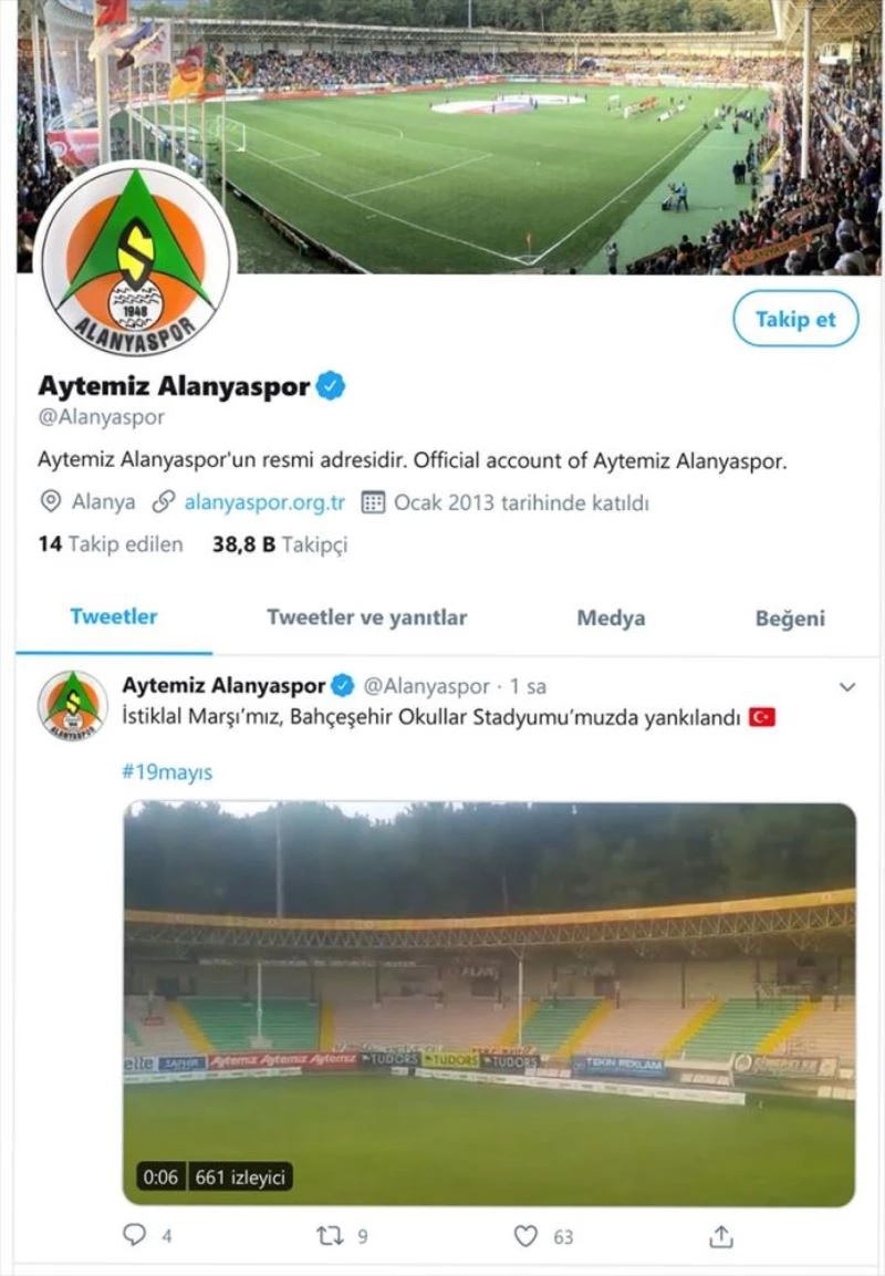 Aytemiz Alanyaspor da bu ani sosyal medya hesabindan, "Istiklal Marsimiz Bahçesehir Okullari Stadyumu'muzda yankilandi" mesajiyla paylasti.
