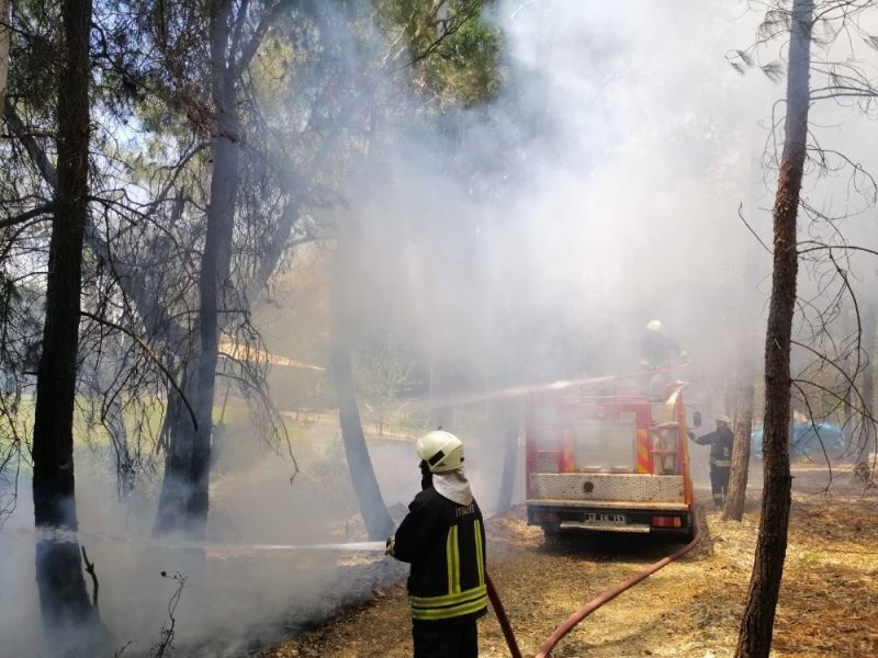 Muğla’nın Seydikemer ilçesinde yanan çalıların arasında gördüğü kirpiyi alevlerden kurtaran itfaiye eri kirpiyi kurtararak su ile serinletti.