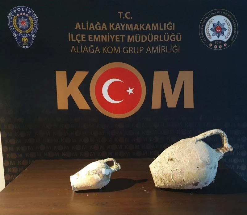 Edinilen bilgiye göre, Aliağa İlçe Emniyet Müdürlüğü Kaçakçılık ve Organize Suçlarla Mücadele Grup Amirliği tarafından sorumluluk bölgelerinde tarihi eser kaçakçılıkları ile ilgili olarak sosyal medya üzerinden çalışma yapıldı. Çalışmalarda, antik amfora olduğu değerlendirilen obje ile ilgili olarak gerekli araştırmalar yapılıp Dikili Cumhuriyet Başsavcılığından alınan talimat gereği Dikili ilçesinde faaliyet gösteren bir işyerinde arama düzenlendi. Ekiplerin yaptığı aramalarda, yaklaşık 30 ve 60 cm uzunluklarında tek kulpu olan testiye benzer 2 adet içi boş obje ele ele geçirildi. Polis ekipleri tarafından ele geçirilen objeler ile ilgili olarak Bergama Müze Müdürlüğü tarafından yapılan inceleme neticesinde, eserlerin Doğu Roma (Bizans) dönemine ait tespit edildi. Ele geçirilen eserler yetkililere teslim edildi. Öte yandan konu ile ilgili olarak işyeri sahibi E.S. isimli şüpheli şahsa 2863 sayılı Kültür ve Tabiat Varlıkları Kanununa Muhalefet suçundan adli işlem yapıldığı öğrenildi.