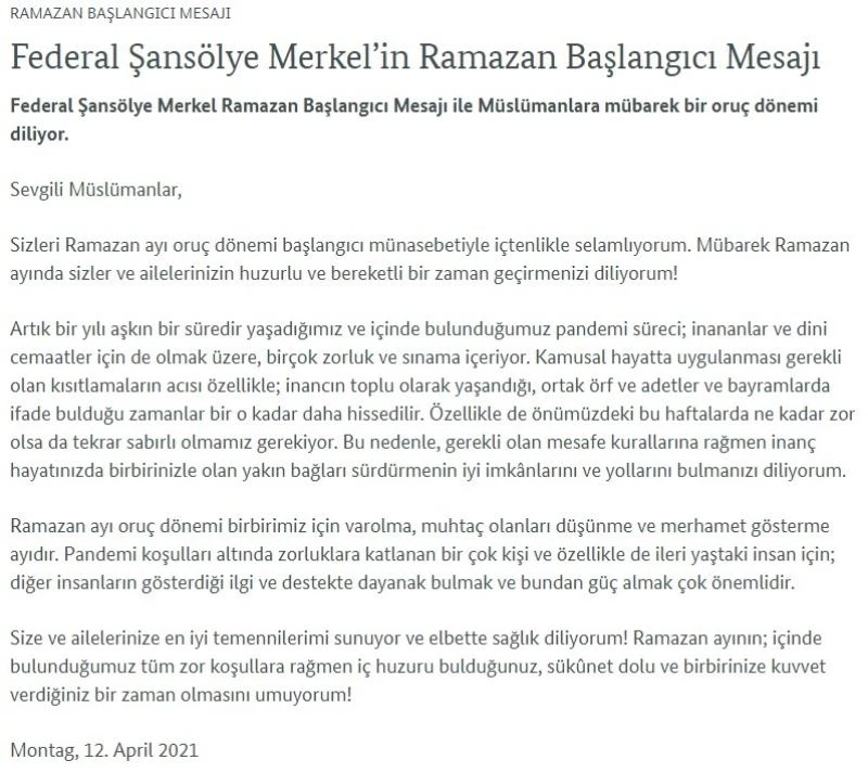 “Ramazan ayı oruç dönemi birbirimiz için var olma, muhtaç olanları düşünme ve merhamet gösterme ayıdır” diyen Merkel, “Pandemi koşulları altında zorluklara katlanan birçok kişi ve özellikle de ileri yaştaki insan için diğer insanların gösterdiği ilgi ve destekte dayanak bulmak ve bundan güç almak çok önemlidir” dedi.