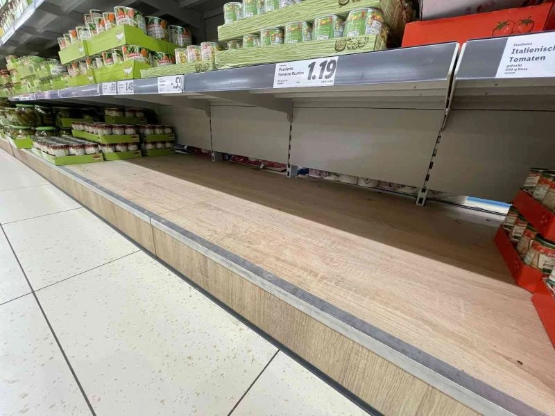 Almanya’da Rusya ile Ukrayna arasındaki savaş sebebi ile bazı temel gıda maddelerinde tedarik sıkıntısı yaşanınca raflar boş kaldı.