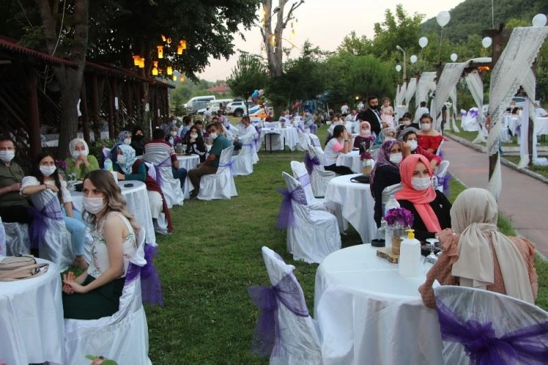 Devrek Karasu Düğün Salonunda düzenlenen Nilüfer ve Hüseyin Sarı’nın düğününe Covid-19 nedeniyle davetliler çeşitli önlemler alınarak içeri alınmaya başlandı. Ateş ölçer, dezenfektasyon ve maskeli olarak düğüne katılan davetlilere soysal mesafe kurallarına uyulması için mikrofondan sık sık uyarılarda bulunulurken, salonun pistinde sadece gelin ve damat dans edip oynadılar. Takı merasiminde de sosyal mesafe kurallarına riayet eden davetlilerin 4 metre uzunluğunda ki para takıları ise bir birine yapıştırılarak gelin ve damadın boynuna takıldı. Damat Hüseyin ve Gelin Nilüfer Sarı’ın Almanya’da bulunan akrabaları korona virüs nedeniyle katılamazlarken, mutlu günlerine katılamayan akrabalarına düğünü uzaktan bağlantı ile izlettirdiler.
