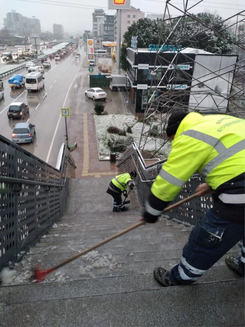 Kent Estetiği Şube Müdürlüğüne bağlı mobilize ekipler, yaya alt ve üst geçitlerde solüsyonlama ve kar temizliği çalışması gerçekleştirecek. Kent Meydanı, Şehreküstü, Heykel, Ankara Yolu, İzmir Yolu, İstanbul Yolu ve Mudanya Yolu’ndaki tüm alt ve üst geçitler ile Acemler alt ve üst geçitlerinde, havaalanlarında kullanılan özel buzlanma önleyici solüsyonlarla, 48 saat boyunca buzlanmaya karşı koruma sağlanıyor. Toplam 21 alt geçit ve 54 üst geçitte süreç boyunca sürekli teyakkuzda tutulacak olan ekiplerle, periyodik olarak, mücadele planı doğrultusunda, solüsyonlama ve temizlik çalışmaları devam edecek.