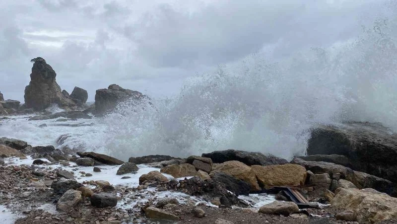 Saatteki hızı 45 kilometreyi bulan fırtınayla birlikte Küçük Liman mevkiinde kayalıklara vurup kırılan dalgalarla beraber sular metrelerce yüksekliğe çıktı.