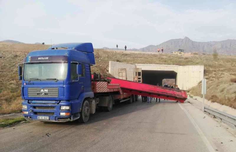 Amasya’da vinç yüklü tır, geçmeye çalıştığı altgeçite takıldı.